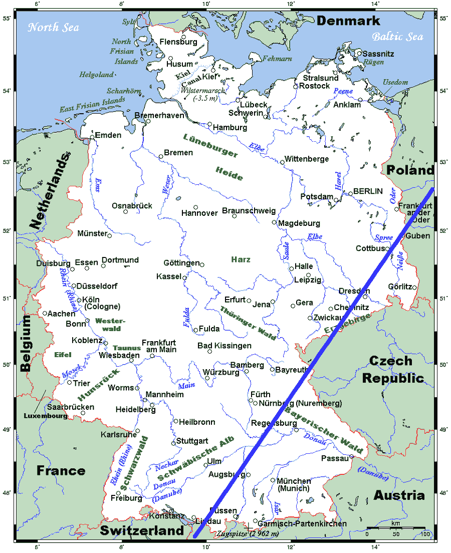 Sichtbarkeit des Merkurtransits 2016 in Mitteleuropa. Links (westlich der blauen Linie) konnte der Transit im gesamten Verlauf beobachtet werden. Rechts (östlich) der Linie ging die Sonne unter, bevor der Transit beendet war.